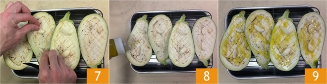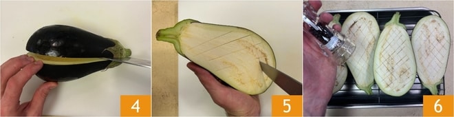 Maintenant, prenez l’aubergine violette et l’aubergine zébrée, coupez-les en deux 4 et incisez la pulpe en forme de damier 5. Disposez-les dans un plat avec la partie coupée vers le haut et assaisonnez de sel et de poivre 6.