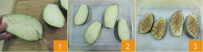Pour préparer les spaghettis complets aux aubergines rôties et menthe, commencez par couper les aubergines en deux dans le sens de la longueur et incisez la chair avec un couteau de manière à former un quadrillage, sans atteindre la peau 1. Disposez les aubergines sur une plaque recouverte de papier sulfurisé, face coupée vers le haut 2 et faites cuire dans un four ventilé préchauffé à 210° pendant 40 minutes 3.