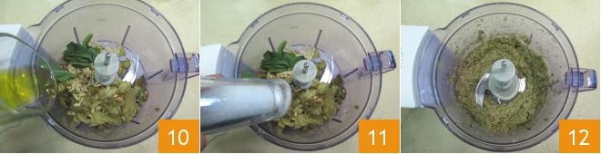 Ajoutez également l'huile 10, le sel 11 et le poivre et mixez jusqu'à obtenir une consistance homogène 12.