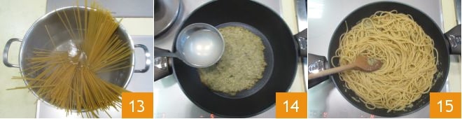 À ce stade, l'eau sera arrivée à ébullition, donc faites cuire les spaghettis pendant le temps indiqué sur l'emballage 13. Versez la crème d'aubergines dans une poêle, diluez avec une louche d'eau de cuisson des pâtes 14 et chauffez doucement. Quand les pâtes sont al dente, égouttez-les directement dans la poêle et mélangez à feu moyen pour bien amalgamer le tout 15.