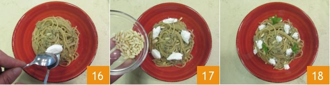 Après avoir dressé les assiettes, complétez chaque plat avec des morceaux de ricotta 16, les pignons restants 17 et quelques feuilles de menthe : vos spaghettis complets aux aubergines rôties et menthe sont prêts à être servis 18 !