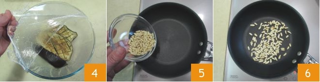 Transférez les aubergines cuites dans un bol, couvrez avec un film transparent 4 et laissez reposer pendant 5 minutes : la vapeur facilitera le décollage de la chair de la peau. Pendant ce temps, mettez une casserole d'eau à bouillir pour cuire les pâtes et versez les pignons dans une poêle antiadhésive bien chaude 5 : faites-les griller environ 5 minutes en remuant fréquemment 6, puis mettez-les de côté.