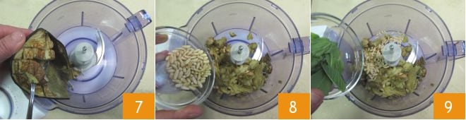 Prélevez la chair des aubergines à l'aide d'une cuillère et déposez-la dans un mixeur 7, puis ajoutez environ la moitié des pignons grillés 8 et 6 feuilles de menthe 9.