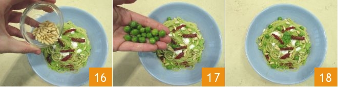 Procédez au dressage : distribuez les spaghettis dans l'assiette, ajoutez un peu de stracciatella en l'étalant en petits morceaux, quelques filets de tomate, le reste des pignons 16, les pois crus mis de côté 17 et enfin garnissez avec les feuilles de basilic. Vos spaghettis complets avec pesto de pois frais sont prêts à être dégustés 18!