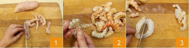 Pour réaliser les spaghettis sautés avec poulet et crevettes, commencez par couper le blanc de poulet en lamelles 1 en éliminant l'os central s'il est présent. Nettoyez les crevettes : détachez la tête, la queue et retirez la carapace 2, puis coupez-les en deux dans le sens de la longueur 3 et sortez l'intestin avec un cure-dent.