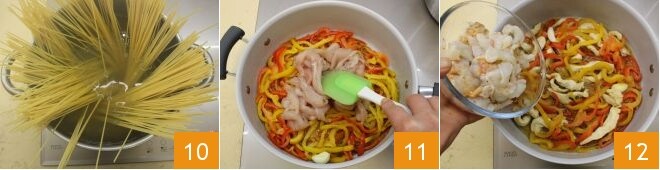 Faites cuire les spaghettis dans une grande quantité d'eau bouillante, salée selon votre goût 10. Pendant ce temps, ajoutez le poulet aux poivrons 11 et faites cuire pendant 4-5 minutes, ajoutez finalement aussi les crevettes 12 et 50 g supplémentaires de sauce soja, continuez la cuisson pendant 5 minutes supplémentaires.