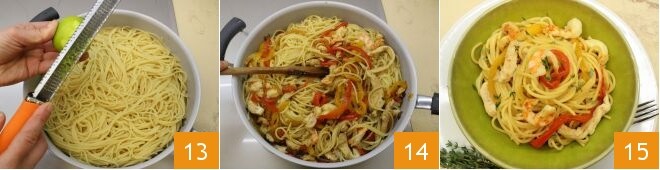 Quand les spaghettis sont cuits, égouttez-les directement dans la poêle avec les poivrons en gardant de côté quelques louches d'eau de cuisson, aromatisez avec le zeste d'un citron vert ou citron râpé 13 et le thym. Ajoutez une louche d'eau de cuisson et faites-les sauter pendant quelques secondes 14. Servez les spaghettis sautés avec poulet et crevettes bien chauds 15.