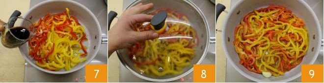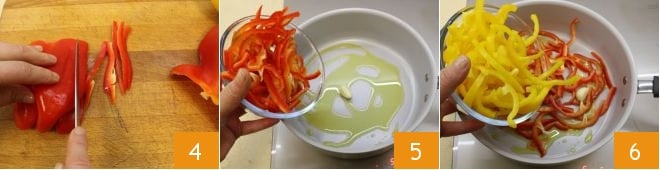 Coupez les poivrons en lamelles 4 après avoir retiré la tige, les filaments et les graines internes. Faites revenir dans une poêle l'huile d'olive avec la gousse d'ail, puis ajoutez les poivrons (5-6)