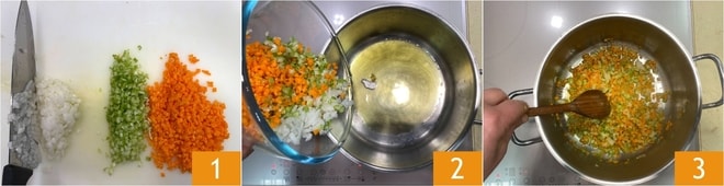 Pour préparer le spaghettone au ragoût de poulet, commencez par hacher l'oignon, le céleri et la carotte 1. Dans une casserole, versez l'huile d'olive et faites mijoter le hachis 2 jusqu'à ce qu'il ramollisse 3.
