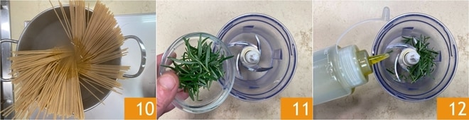 Cueillez les spaghettones intégrales dans une grande quantité d'eau salée 10. Occupez-vous de l'huile au romarin: mixez le romarin 11 et l'huile d'olive extra-vierge 12.