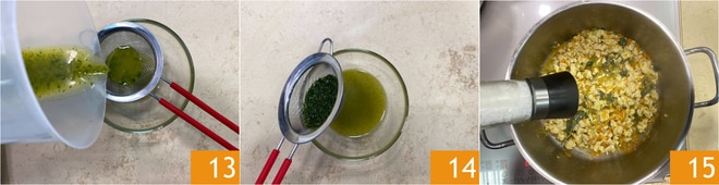 Filtrez la sauce obtenue avec une passoire 13 et mettez-la de côté 14, elle vous servira pour mélanger les pâtes. Ajustez le sel du ragoût de poulet 15.
