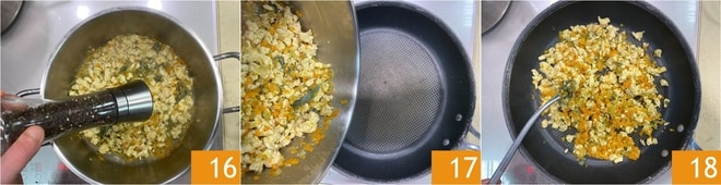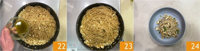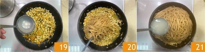 Ajoutez une louche d'eau de cuisson des pâtes 19, puis égouttez les spaghettones al dente ici 20. Complétez la cuisson dans la poêle avec un peu plus d'eau si besoin 21.