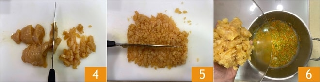 Coupez le blanc de poulet en morceaux 4 puis hachez-le au couteau 5. Versez la viande hachée de poulet dans le soffritto 6.