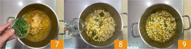 Assaisonnez avec les herbes aromatiques 7, faites bien rissoler, puis déglacez avec le vin blanc 8. Laissez évaporer le vin et faites cuire sans couvercle pendant environ 10-15 minutes à feu doux 9.