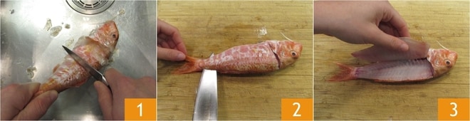 Pour réaliser le spaghettone au ragoût de rougets, commencez par nettoyer le poisson : écailler les rougets sous l'eau courante 1 et couper les nageoires avec des ciseaux, puis bien les sécher et récupérer les filets 2 3.