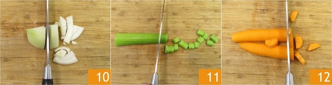 Préparez également les autres ingrédients pour le fond de cuisson : épluchez et coupez grossièrement l'oignon 10, le céleri 11 et les carottes 12, puis écrasez la gousse d'ail non pelée.