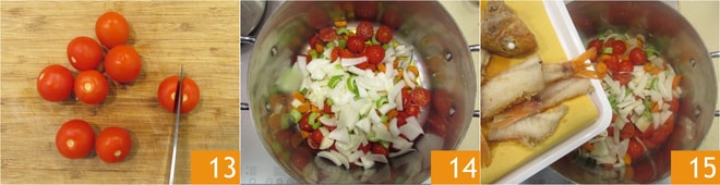 Coupez les tomates cerises en deux 13 et mélangez tous les légumes dans un bol. Faites dorer les légumes dans une casserole avec un filet d'huile 14, salez et poivrez, puis ajoutez les arêtes frites 15 et continuez à faire dorer.