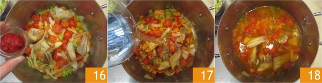 Lorsque le fond commence à accrocher, déglacez avec le vin blanc et laissez évaporer complètement la partie alcoolique, puis ajoutez le concentré de tomate 16 et mélangez pendant 5 minutes. À ce stade, couvrez avec de l'eau 17, aromatisez avec le fenouil sauvage et laissez cuire pendant une heure et demie, sans couvercle 18.