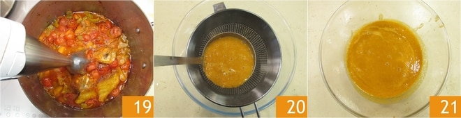 Après le temps de cuisson, mixez le fond avec un mixeur plongeant 19 et filtrez-le à travers un chinois 20 pour obtenir une consistance lisse et homogène 21.