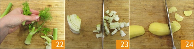 Pendant que le fond cuit, vous pouvez vous occuper de la crème de fenouil : coupez les tiges du fenouil et mettez de côté les pluches 22, puis divisez le fenouil en 4 quartiers, retirez la partie centrale plus dure et coupez le reste en morceaux 23. Épluchez la pomme de terre et tranchez-la finement 24.