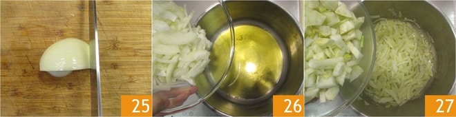 Enfin, pelez l'oignon et émincez-le également finement 25. Chauffez un filet d'huile dans une casserole et faites revenir l'oignon pendant quelques minutes 26, puis ajoutez les fenouils 27.