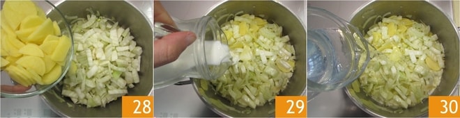 Ajoutez également les pommes de terre 28 et faites revenir le tout pendant 5 minutes, en ajustant le sel et le poivre. À ce stade, versez le lait 29 et couvrez avec de l'eau 30.