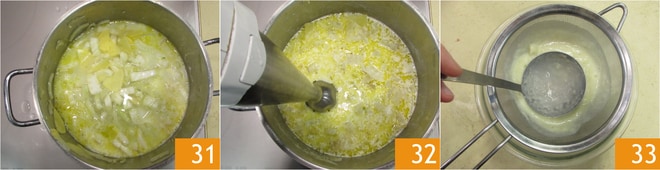 Laissez cuire pendant environ 40 minutes 31. Après ce temps, ajoutez les pluches de fenouil et mixez avec un mixeur plongeant 32, puis filtrez la crème obtenue à travers un chinois 33.