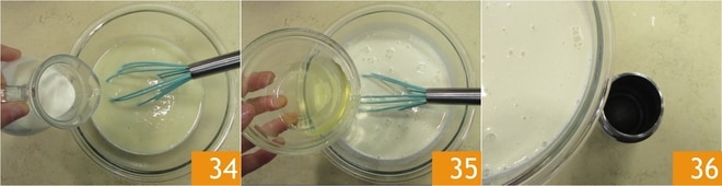 Ajustez la crème de sel et de poivre, puis ajoutez la crème fraîche 34 et le blanc d'œuf 35 tout en mélangeant bien avec un fouet. Transférez la crème de fenouil dans un siphon 36, vissez-le fermement et chargez-le avec le gaz, en veillant à le retourner pendant cette opération.