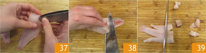 Pour finir, préparez la sauce : reprenez les filets de rouget et retirez les arêtes avec une pince 37, puis enlevez la peau 38 et coupez la chair en dés 39.