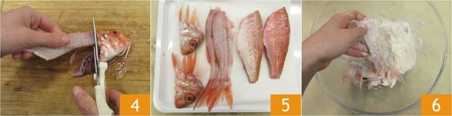 Enlevez la partie du foie et coupez les arêtes en 2 morceaux 4, puis nettoyez la tête et rincez le tout. Une fois que vous avez séparé les filets de poisson de la tête et des arêtes 5, mettez les premiers de côté et farinez le reste dans un bol 6.