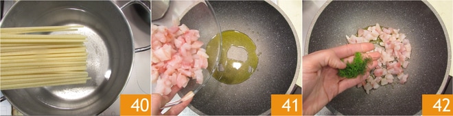 Portez à ébullition une casserole d'eau salée et plongez-y les spaghettoni 40. En attendant, versez les rougets 41 et du fenouil dans une poêle avec l'huile bien chaude 42.