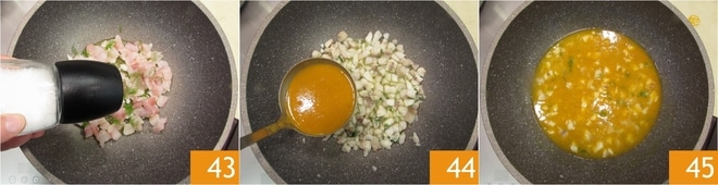 Salez 43 et faites dorer brièvement à feu vif, puis ajoutez le fond de rouget 44. Faites cuire le tout pendant environ 5 minutes 45.