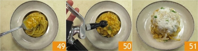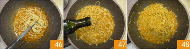 Égouttez les spaghettoni encore très al dente et transférez-les dans la poêle 46. Terminez la cuisson des pâtes dans la sauce, en ajoutant un filet d'huile 47, un tour de moulin à poivre et, si nécessaire, une louche d'eau de cuisson. Mélangez bien le tout 48.