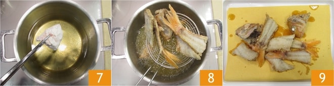 Chauffez l'huile de graines dans une petite casserole et faites frire les déchets du poisson 7. Lorsqu'ils sont dorés, égouttez 8 et transférez sur du papier absorbant pour friture 9.