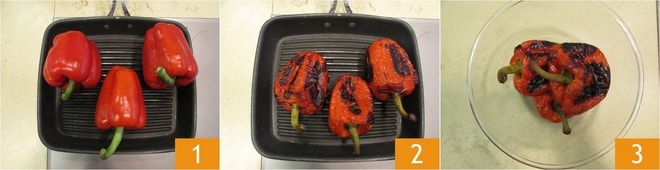 Pour préparer les spaghettoni à la crème de poivrons et morue, la première chose à faire est de bien laver les poivrons et de les sécher. Faites chauffer un grill sur le feu, puis placez les poivrons dessus 1. Faites-les cuire pendant environ 40 minutes, en les retournant souvent pour ne pas les brûler. Lorsqu'ils sont cuits, transférez-les dans un bol 3.