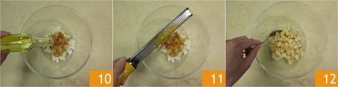 Ajoutez un filet d'huile 10 et le zeste râpé d'un citron 11. Mélangez bien pour homogénéiser toutes les saveurs 12.