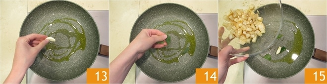 Faites chauffer un peu d'huile dans une poêle, ajoutez l'ail 13 et les feuilles de laurier émiettées. Laissez chauffer et ajoutez la morue 15.