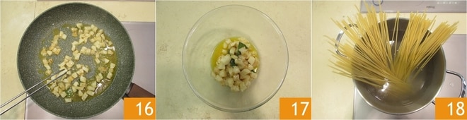 Faites cuire très peu, puis retirez l'ail 16 et transférez dans un bol 17. Faites cuire les spaghettoni dans beaucoup d'eau bouillante, salée selon votre goût 18.