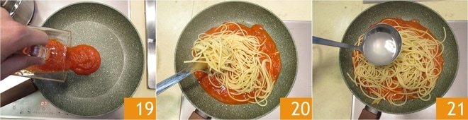Versez la crème de poivrons dans la poêle 19 et faites-la chauffer. Égouttez les spaghettoni al dente et transférez-les dans la poêle 20, en gardant un peu d'eau de cuisson qui sera ajoutée ensuite 21.