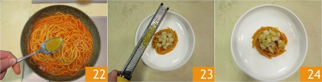 Terminez la cuisson des spaghettoni dans la poêle, en ajoutant également l'huile de la morue 22. Réalisez maintenant un nid de spaghettoni et transférez-le dans une assiette. Ajoutez par-dessus les cubes de morue et un peu de zeste râpé de citron 23. Les spaghettoni à la crème de poivrons et morue sont prêts à être servis 24.