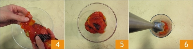 Enlevez la peau 4 et éliminez les graines internes. Transférez-les au fur et à mesure dans un récipient long et étroit 5. Mixez maintenant avec un mixeur plongeant 6.