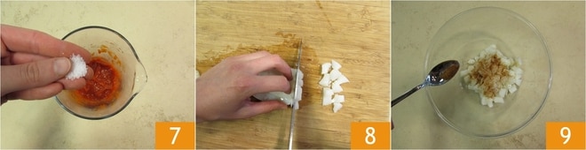 Une fois que vous avez obtenu une crème homogène, ajustez le sel 7 et mettez de côté. Passez maintenant à la morue, coupez-la en dés 8 et transférez-la dans un bol. Ajoutez du piment en poudre 9.
