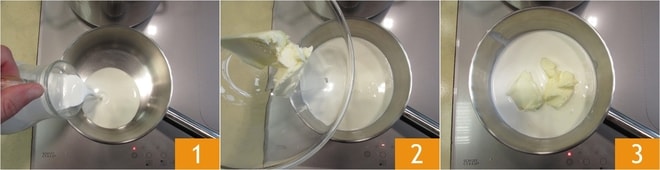 Pour préparer les spaghettoni avec fondue de scimudin, commencez par mettre sur le feu une casserole d'eau salée qui servira pour la cuisson des pâtes. Passez maintenant à la fondue : versez dans une petite casserole la crème 1 et le beurre 2. Chauffez jusqu'à ébullition 3.