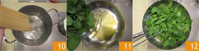 Lancez les spaghettoni dans l'eau qui aura atteint l'ébullition 10. Pendant ce temps, dans une poêle chaude, versez un filet d'huile et les épinards 11. Faites-les sauter quelques minutes, sans les laisser complètement flétrir 12.