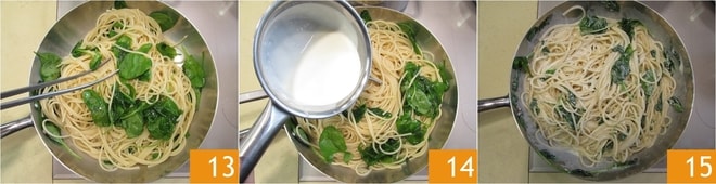 Lorsque les spaghettis sont al dente, égouttez-les et transférez-les directement dans la poêle avec les épinards 13. Versez également la fondue 14 et faites sauter les spaghettis 15.