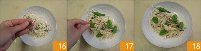 Il est temps de dresser : disposez les spaghettoni dans une assiette. Ajoutez un peu de fondue restante au fond de la poêle, saupoudrez de pesteda 16 et ajoutez encore quelques feuilles d'épinard 17. Les spaghettoni avec fondue de scimudin sont prêts à être servis 18. Dégustez-les immédiatement !