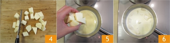 En attendant, coupez le fromage en dés 4. Dès que la crème atteint l'ébullition, éteignez le feu et laissez refroidir pendant environ 1 minute. Ajoutez le scimudin à la crème 5 et laissez reposer quelques minutes 6. Il est important de laisser baisser la température de la crème pour ne pas refaire une nouvelle coagulation du fromage.