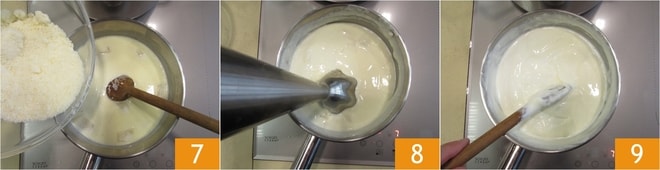Ajoutez également le Parmesan râpé 7 et mixez le tout avec un mixeur plongeant 8 pour obtenir une crème homogène et veloutée.