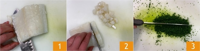 Pour préparer les spaghettoni avec morue, crème de pommes de terre et safran, commencez par nettoyer le filet de morue en retirant la peau 1 et les éventuelles arêtes, puis coupez-le en cubes d'environ 2 cm 2. Hachez finement le persil en gardant les tiges de côté 3.