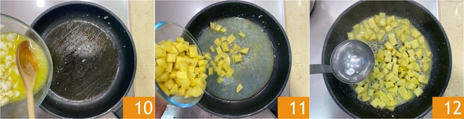 Versez le jus de cuisson de la morue dans la même poêle 10, ajoutez les pommes de terre 11 et faites cuire à feu moyen-doux pendant environ 15 minutes, en ajoutant de l'eau si nécessaire 12.